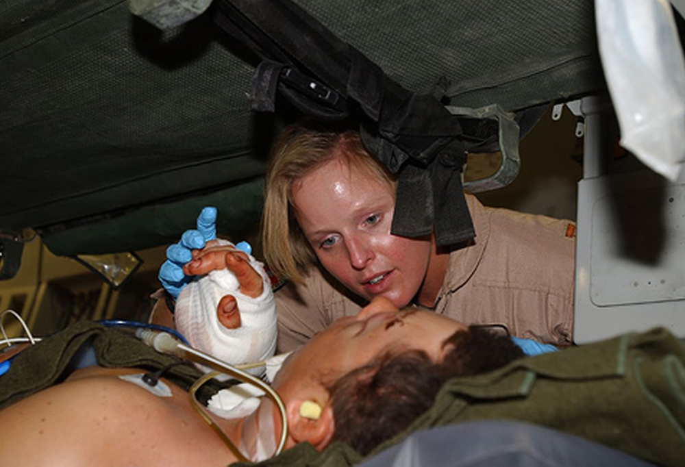 They're in an airplane that looks to be crowded (note the stretcher suspended above her patient) and probably a bit noisy, so she's put ear plugs in his ears, but probably not hers. She's an airborne nurse who is seeing casualties direct from the combat theater (Afghanistan in this case) to more sophisticated medical facility (Germany in this case), so she gets the freshly wounded. Note this soldier still has bloody fingers.